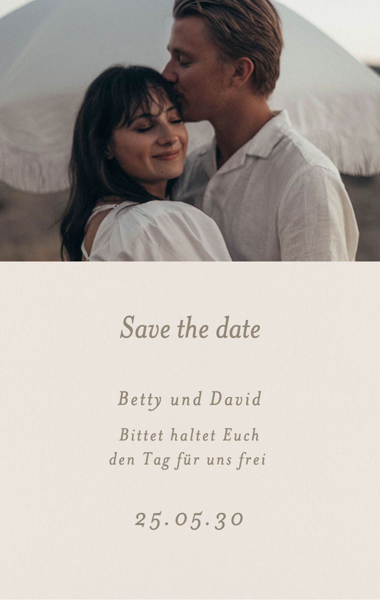 Bereiten Sie Ihren besonderen Tag stilvoll vor! Unsere virtuellen Save The Date Karten sind so gestaltet, dass sie Ihr Hochzeitsdatum elegant und unvergesslich ankündigen. Stellen Sie sicher, dass Ihre Lieben dieses außergewöhnliche Datum jetzt reservieren, mit unseren einfach zu sendenden und zu teilenden Online-Einladungen.