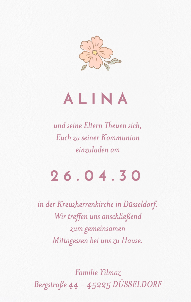 Bereiten Sie diese besondere Feier stilvoll vor! Unsere virtuellen Einladungen sind so gestaltet, dass sie das Datum der Taufe Ihres Kindes elegant und unvergesslich ankündigen. Stellen Sie sicher, dass Ihre Lieben diesen wertvollen Moment jetzt reservieren, mit unseren einfach zu sendenden und zu teilenden Online-Einladungen.
