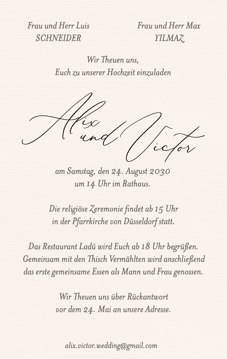 Bereiten Sie Ihren besonderen Tag stilvoll vor! Unsere virtuellen Karten sind so gestaltet, dass sie Ihr Hochzeitsdatum elegant und unvergesslich ankündigen. Stellen Sie sicher, dass Ihre Lieben dieses außergewöhnliche Datum jetzt reservieren, mit unseren einfach zu sendenden und zu teilenden Online-Einladungen.