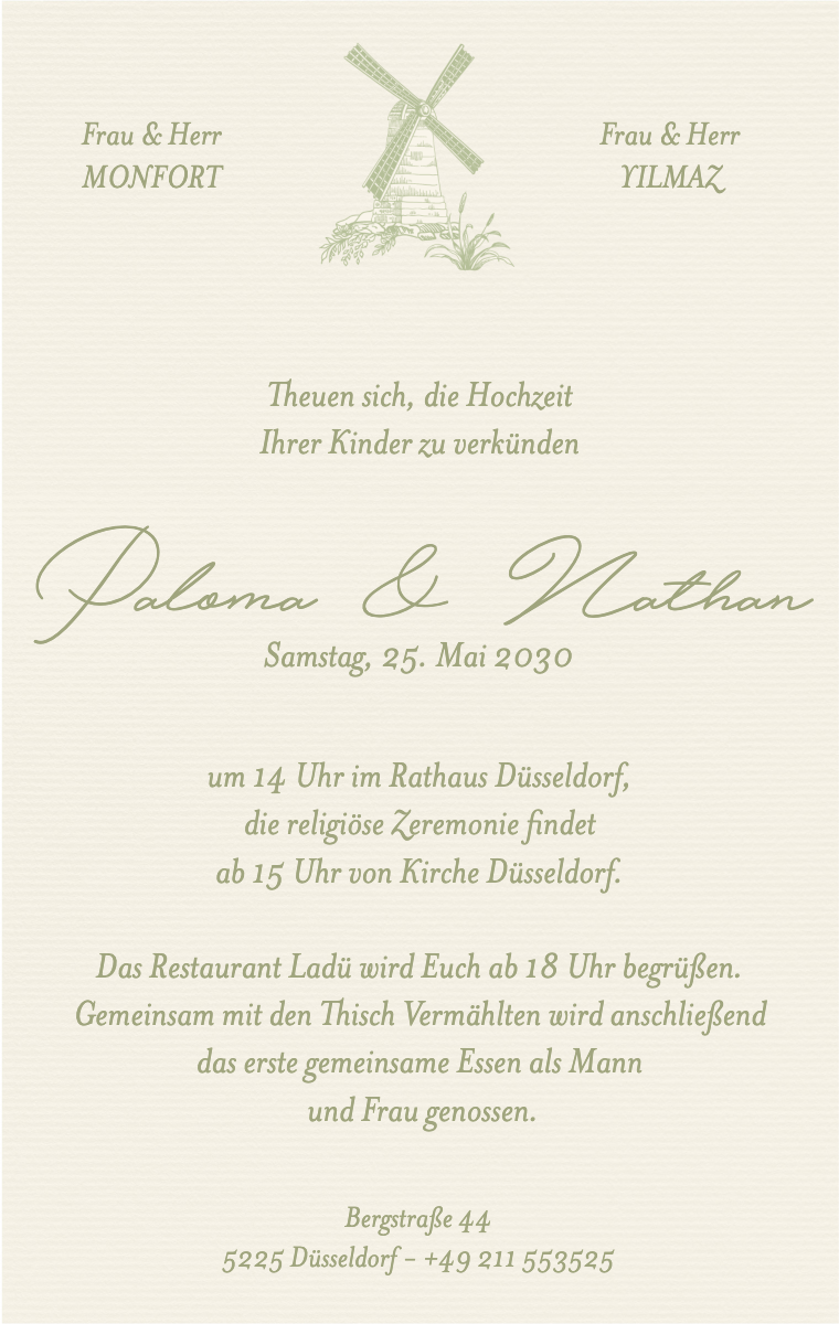 Bereiten Sie Ihren besonderen Tag stilvoll vor! Unsere virtuellen Karten sind so gestaltet, dass sie Ihr Hochzeitsdatum elegant und unvergesslich ankündigen. Stellen Sie sicher, dass Ihre Lieben dieses außergewöhnliche Datum jetzt reservieren, mit unseren einfach zu sendenden und zu teilenden Online-Einladungen.