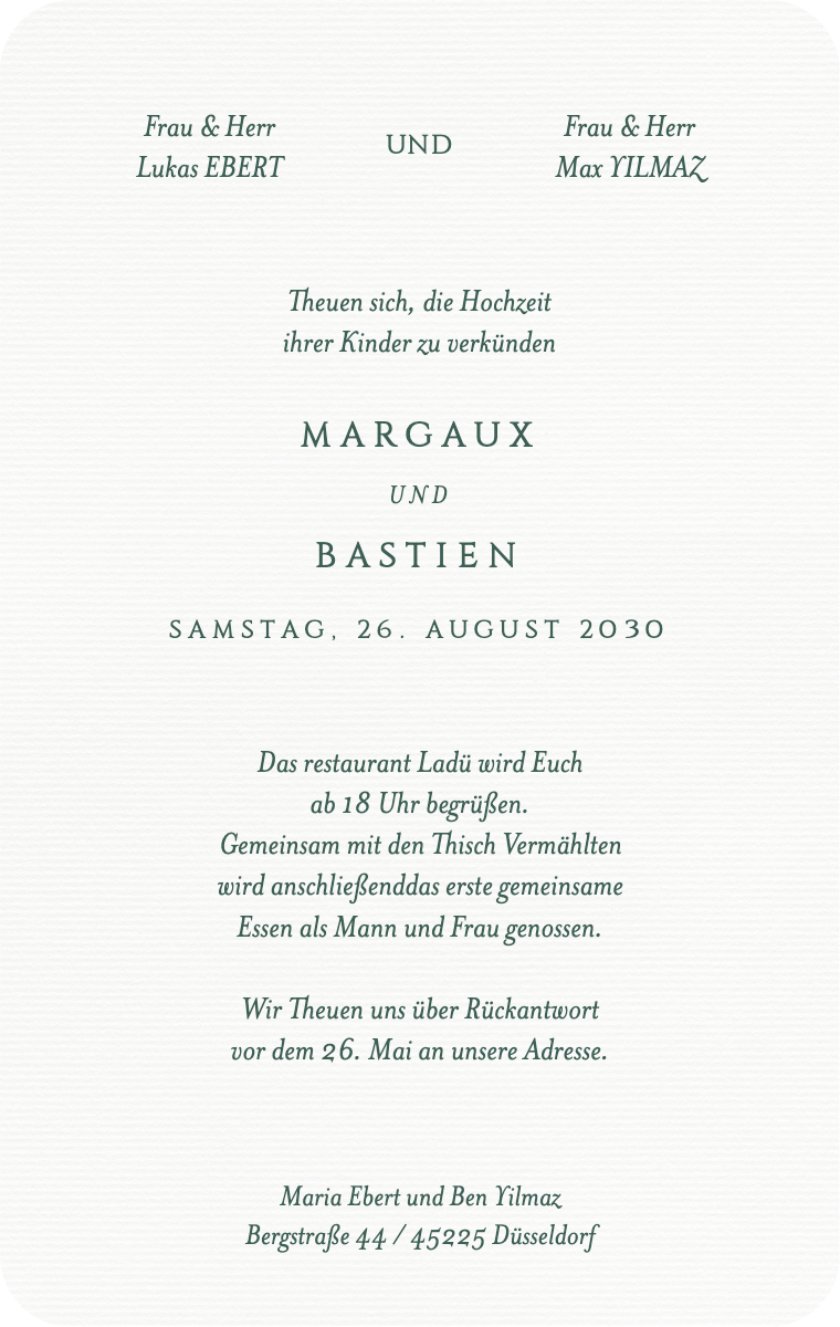 Bereiten Sie Ihren besonderen Tag stilvoll vor! Unsere virtuellen Karten sind so gestaltet, dass sie Ihr Hochzeitsdatum elegant und unvergesslich ankündigen. Stellen Sie sicher, dass Ihre Lieben dieses außergewöhnliche Datum jetzt reservieren, mit unseren einfach zu sendenden und zu teilenden Online-Einladungen.