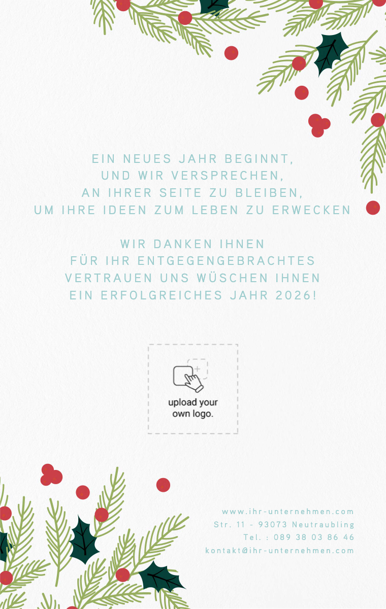 Stärken Sie Ihre Geschäftsbeziehungen mit unseren eleganten und personalisierten virtuellen Grußkarten. Wünschen Sie Ihren Kunden und Partnern ein erfolgreiches Jahr mit herzlichen Nachrichten und professionellen Designs. Zeigen Sie Ihre Wertschätzung und heben Sie sich mit Klasse ab, mit unseren Online-Grußkarten.