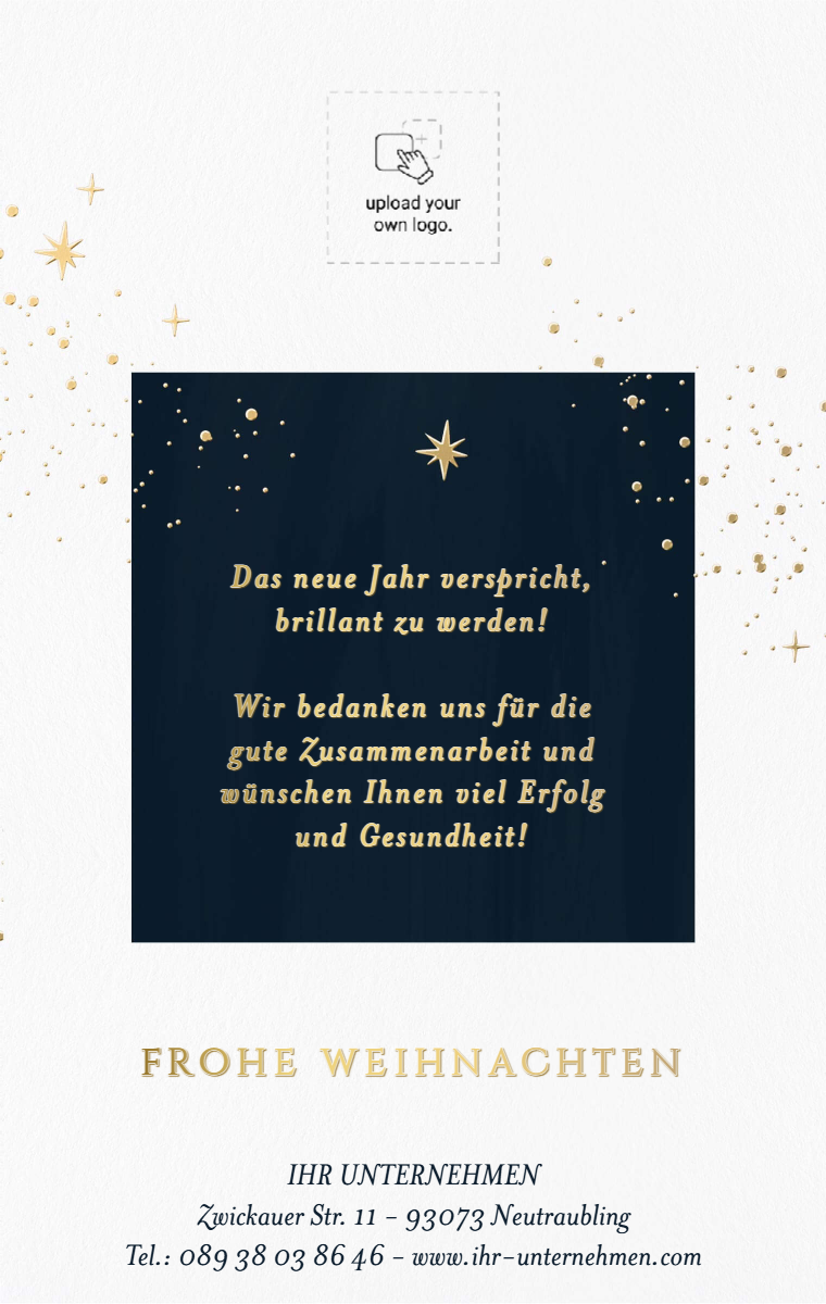 Stärken Sie Ihre Geschäftsbeziehungen mit unseren eleganten und personalisierten virtuellen Grußkarten. Wünschen Sie Ihren Kunden und Partnern ein erfolgreiches Jahr mit herzlichen Nachrichten und professionellen Designs. Zeigen Sie Ihre Wertschätzung und heben Sie sich mit Klasse ab, mit unseren Online-Grußkarten.