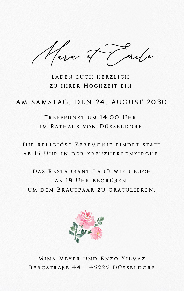 Bereiten Sie Ihren besonderen Tag stilvoll vor! Unsere virtuellen Karten sind so gestaltet, dass sie Ihr Hochzeitsdatum elegant und unvergesslich ankündigen. Stellen Sie sicher, dass Ihre Lieben dieses außergewöhnliche Datum jetzt reservieren, mit unseren einfach zu sendenden und zu teilenden Online-Einladungen.