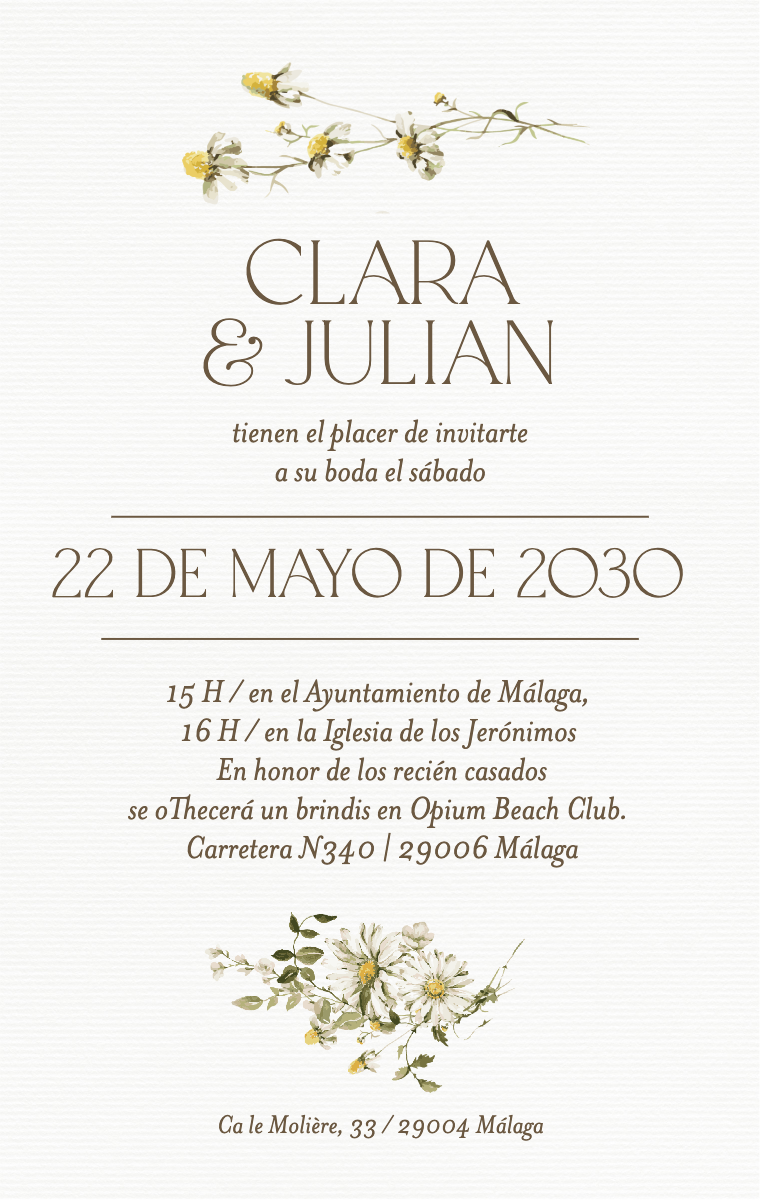 ¡Prepara tu día especial con estilo! Nuestras tarjetas virtuales están diseñadas para anunciar la fecha de tu boda de manera elegante e inolvidable. Asegúrate de que tus seres queridos reserven esta fecha excepcional ahora con nuestras invitaciones en línea fáciles de enviar y compartir.
