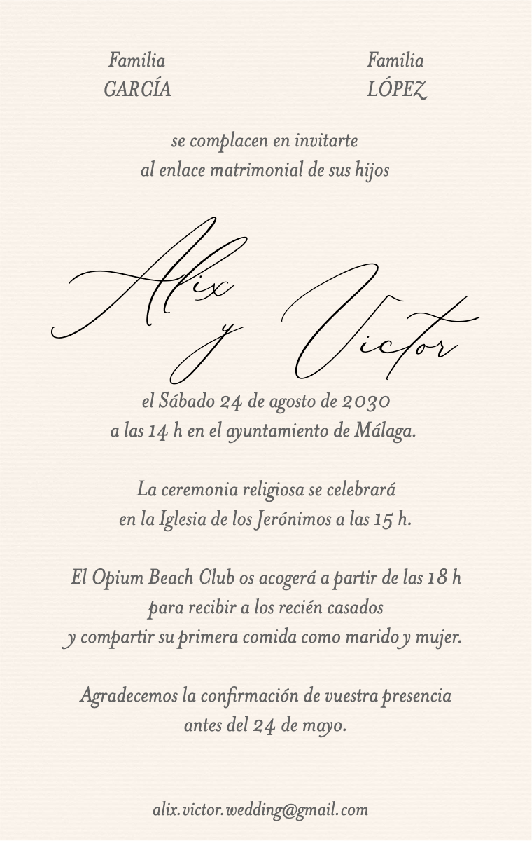 ¡Prepara tu día especial con estilo! Nuestras tarjetas virtuales están diseñadas para anunciar la fecha de tu boda de manera elegante e inolvidable. Asegúrate de que tus seres queridos reserven esta fecha excepcional ahora con nuestras invitaciones en línea fáciles de enviar y compartir.