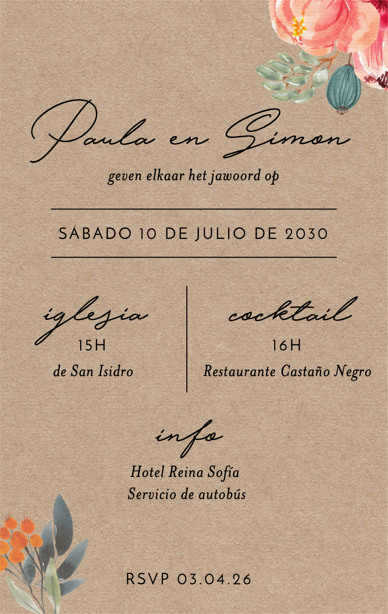 ¡Prepara tu día especial con estilo! Nuestras tarjetas virtuales están diseñadas para anunciar la fecha de tu boda de manera elegante e inolvidable. Asegúrate de que tus seres queridos reserven esta fecha excepcional ahora con nuestras invitaciones en línea fáciles de enviar y compartir.