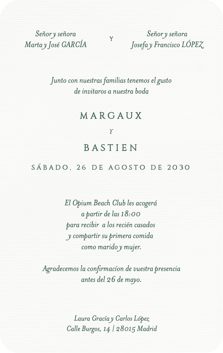 ¡Prepara tu día especial con estilo! Nuestras tarjetas virtuales están diseñadas para anunciar la fecha de tu boda de manera elegante e inolvidable. Asegúrate de que tus seres queridos reserven esta fecha excepcional ahora con nuestras invitaciones en línea fáciles de enviar y compartir.