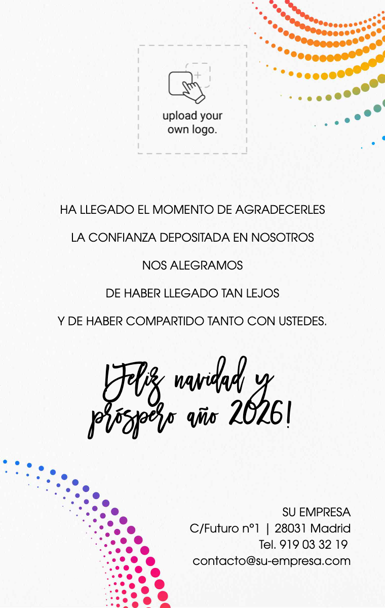 Fortalece tus relaciones profesionales con nuestras tarjetas de felicitación virtuales elegantes y personalizadas. Desea a tus clientes y socios un año próspero con mensajes cálidos y diseños profesionales. Muestra tu agradecimiento y destaca con clase usando nuestras tarjetas de felicitación en línea.