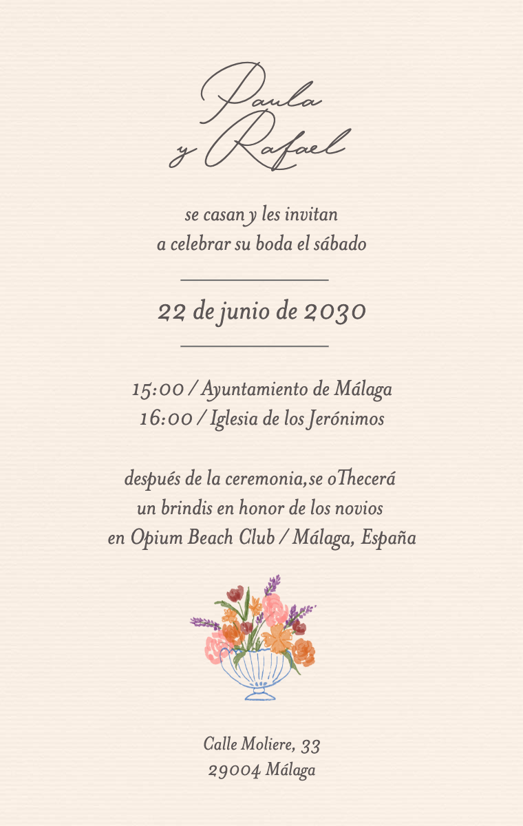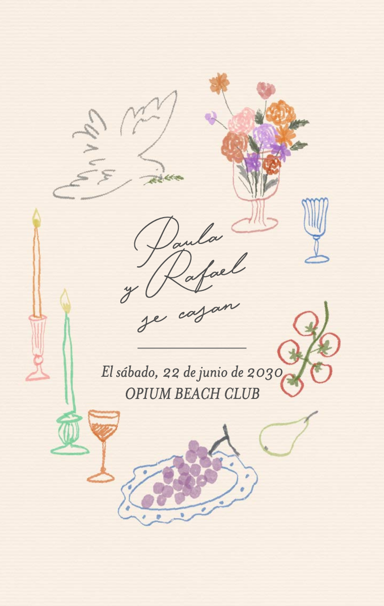 ¡Prepara tu día especial con estilo! Nuestras tarjetas virtuales están diseñadas para anunciar la fecha de tu boda de manera elegante e inolvidable. Asegúrate de que tus seres queridos reserven esta fecha excepcional ahora con nuestras invitaciones en línea fáciles de enviar y compartir.