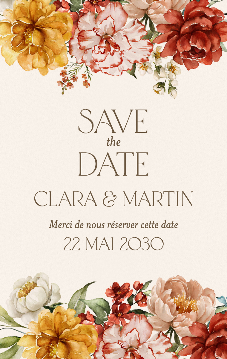 Préparez votre journée spéciale avec style ! Nos cartes virtuelles sont conçues pour annoncer la date de votre mariage de manière élégante et mémorable. Assurez-vous que vos proches réservent cette date exceptionnelle dès maintenant avec nos invitations en ligne faciles à envoyer et à partager.