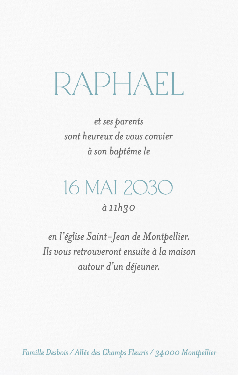 Préparez votre journée spéciale avec style ! Nos cartes d'invitation virtuelles sont conçues pour annoncer la date de son baptême de manière élégante et mémorable. Assurez-vous que vos proches réservent cette date exceptionnelle dès maintenant avec nos invitations en ligne faciles à envoyer et à partager.
