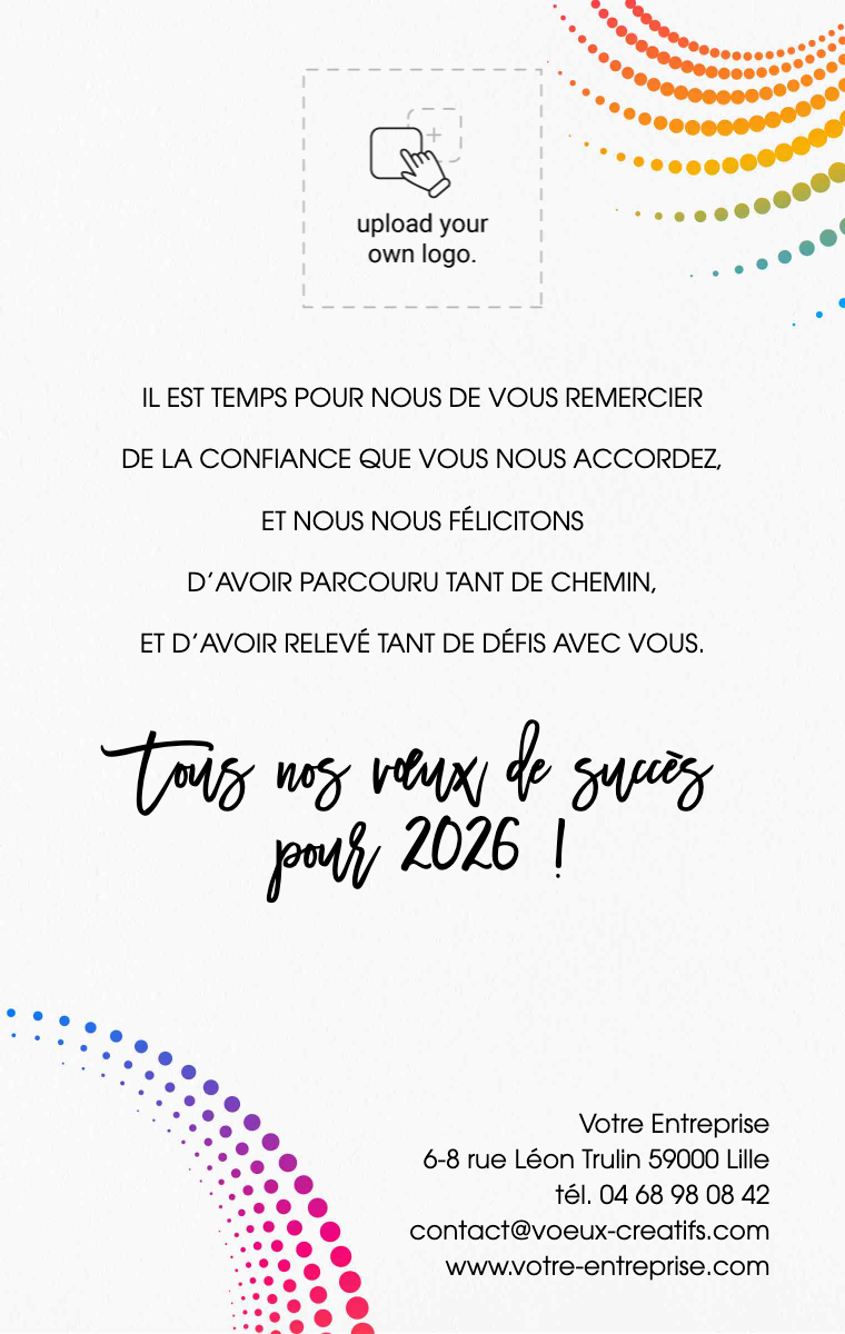 Renforcez vos relations professionnelles avec nos cartes de vœux virtuelles élégantes et personnalisées. Souhaitez une année prospère à vos clients et partenaires avec des messages chaleureux et un design professionnel. Montrez votre appréciation et démarquez-vous avec classe grâce à nos cartes de vœux en ligne.