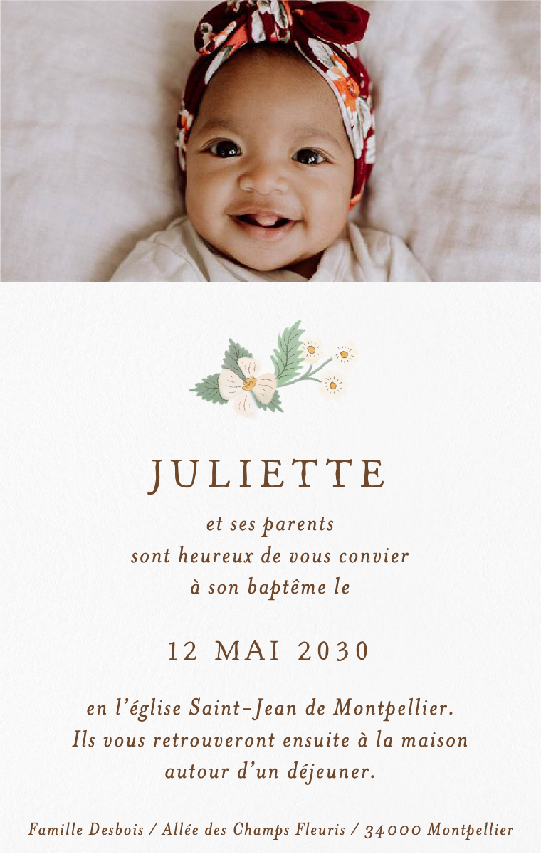 Préparez votre journée spéciale avec style ! Nos cartes d'invitation virtuelles sont conçues pour annoncer la date de son baptême de manière élégante et mémorable. Assurez-vous que vos proches réservent cette date exceptionnelle dès maintenant avec nos invitations en ligne faciles à envoyer et à partager.