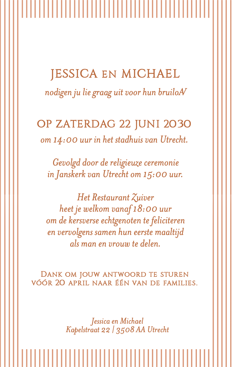 Bereid uw speciale dag stijlvol voor! Onze virtuele kaarten zijn ontworpen om uw trouwdatum elegant en gedenkwaardig aan te kondigen. Zorg ervoor dat uw dierbaren deze bijzondere datum nu reserveren met onze gemakkelijk te verzenden en te delen online uitnodigingen.