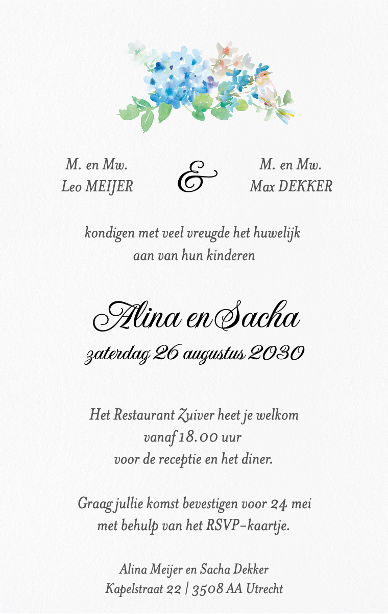 Bereid uw speciale dag stijlvol voor! Onze virtuele kaarten zijn ontworpen om uw trouwdatum elegant en gedenkwaardig aan te kondigen. Zorg ervoor dat uw dierbaren deze bijzondere datum nu reserveren met onze gemakkelijk te verzenden en te delen online uitnodigingen.