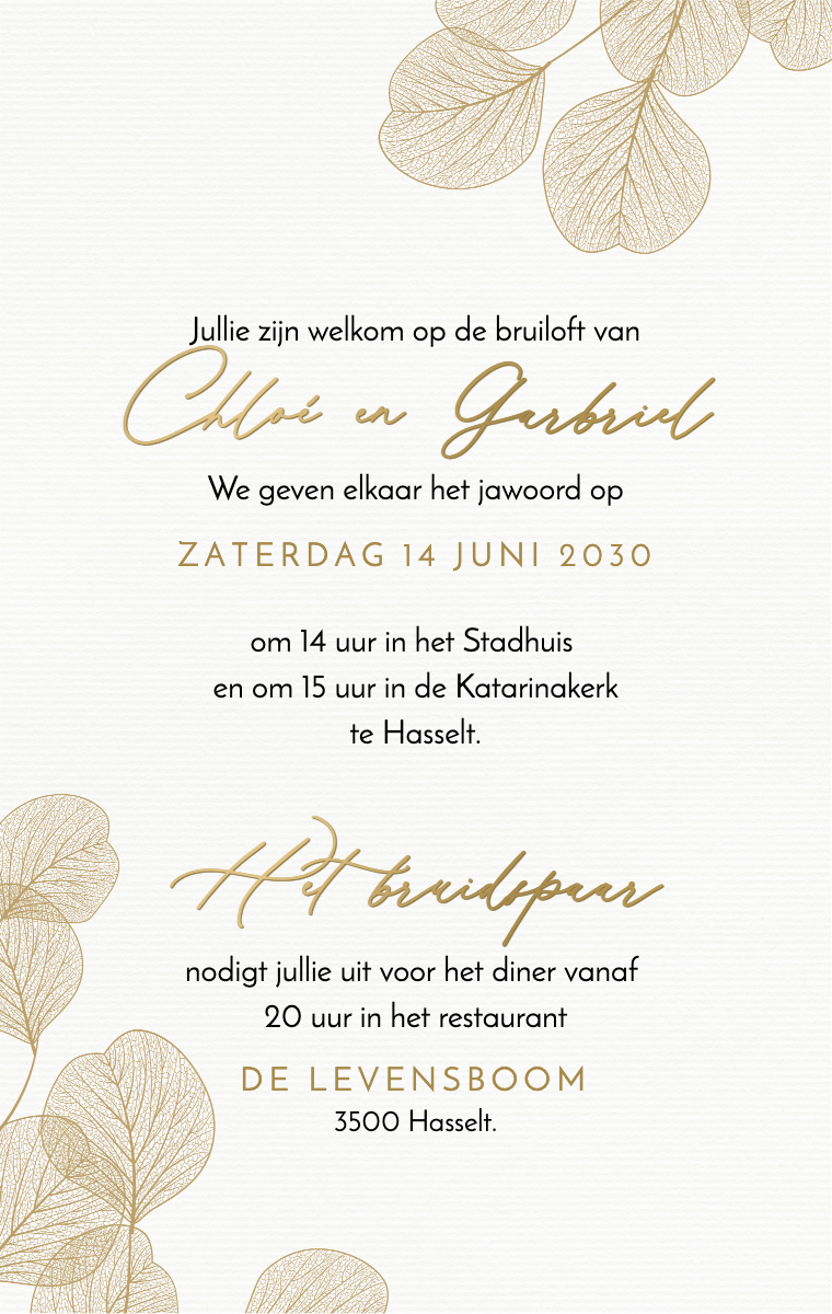 Bereid uw speciale dag stijlvol voor! Onze virtuele kaarten zijn ontworpen om uw trouwdatum elegant en gedenkwaardig aan te kondigen. Zorg ervoor dat uw dierbaren deze bijzondere datum nu reserveren met onze gemakkelijk te verzenden en te delen online uitnodigingen.