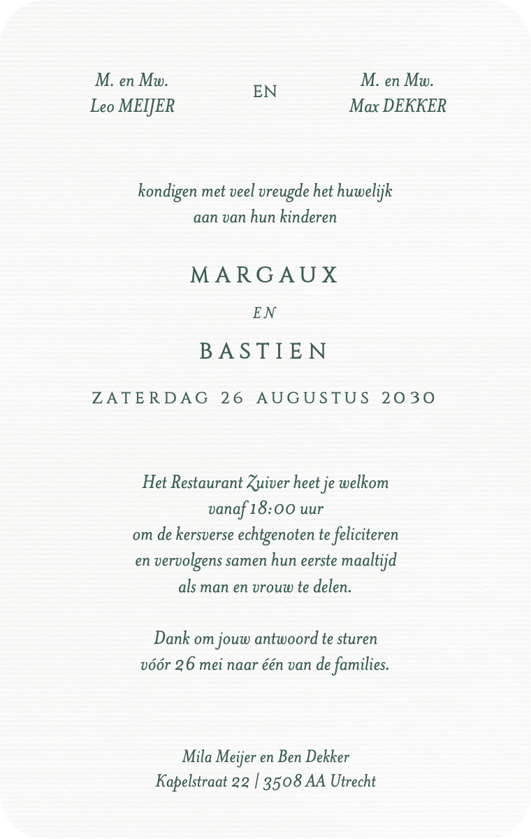Bereid uw speciale dag stijlvol voor! Onze virtuele kaarten zijn ontworpen om uw trouwdatum elegant en gedenkwaardig aan te kondigen. Zorg ervoor dat uw dierbaren deze bijzondere datum nu reserveren met onze gemakkelijk te verzenden en te delen online uitnodigingen.