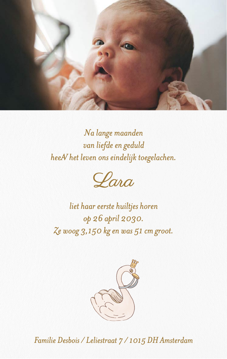 Onze digitale geboortekaartjes delen dit bijzondere moment op een elegante en warme manier. Ze zijn makkelijk te versturen en te delen — en raken je dierbaren meteen.