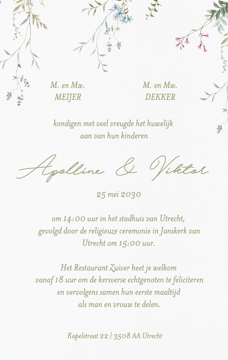 Bereid uw speciale dag stijlvol voor! Onze virtuele kaarten zijn ontworpen om uw trouwdatum elegant en gedenkwaardig aan te kondigen. Zorg ervoor dat uw dierbaren deze bijzondere datum nu reserveren met onze gemakkelijk te verzenden en te delen online uitnodigingen.